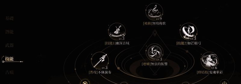 被动:无鸣挽歌。当上场之时同存在原调音域或者是离调音域,则可以进行余音扩散,对音域内敌人造成伤害,无论是哪种音域都可以造成53.35%的连携伤害。