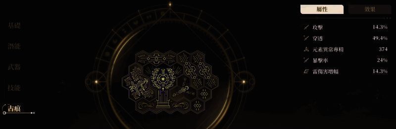 该角色的攻击属性高达14.3%,穿透属性高达49.24%,在游戏当中无论是近身作战还是远程助攻都有着非常不错的表现。成功提升等级后可激发潜能,获得面壁、凝影、洞悉、离穴、破壁、返穴、靓日七大加持技能。