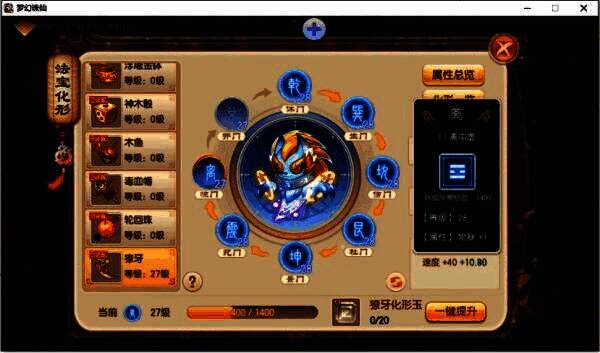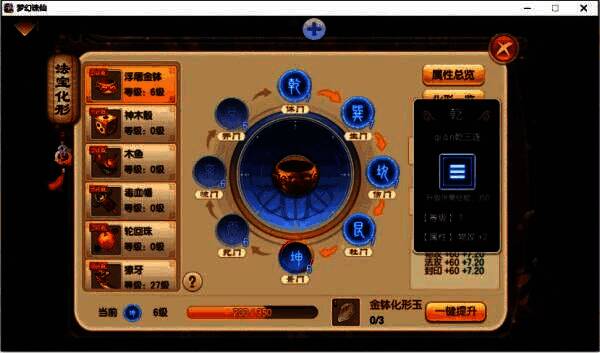 当少侠达到65级后,将会受到有缘人的指引,为法宝注入八卦之力,开启法宝化形功能。此后少侠们可对六个法宝的八卦进行升级培养,提升化形等级,获得高额的属性加成,在化形达到一定等级后,法宝还会化作人形哦~