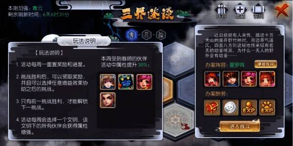 每个线索节点都将邂逅一场战斗,少侠完成挑战后则可自由从获胜后的随机三种增益勋章中,选择一种作为后续战斗的助力。同时每周都会有某一阵营的仙侣得到赐福,使其在三界迷谈玩法中得到全方位的属性增强。