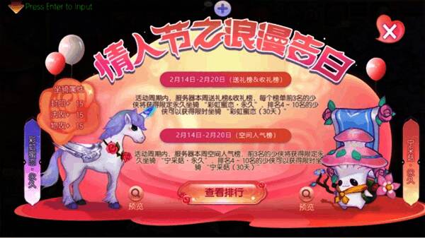芙蓉不及美人妆,水殿风来珠翠香。情人节特别活动——浪漫告白限时开启!2月14日至2月20日期间,服务器将限时开启送礼榜&收礼榜,每个榜单前3名的少快将获得限定永久坐骑"彩可需恋。排名4 - 10名的少侠可以获得限时坐骑“彩虹恋(30天)。
