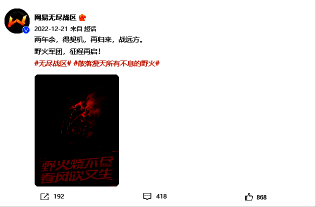 但《无尽战区》的故事才刚刚开始。老的朋友,新的征程,在这片重新点燃的战场之上将书写新的传奇。经过技术的革新、游戏内容的优化,更重要是和所有野火战士们一起经历了这段难忘的旅程,《无尽战区》也许能给玩家们带来更多的惊喜。