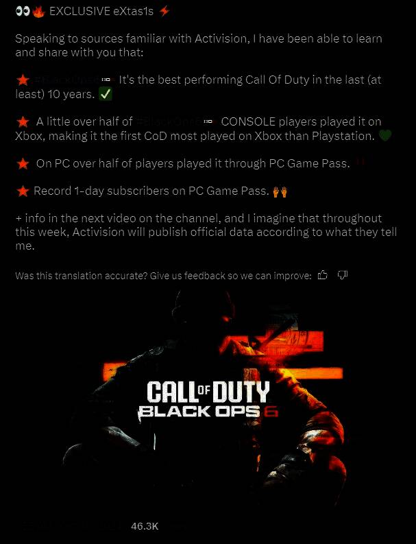 据舅舅eXtas1s爆料,《使命召唤21:黑色行动6》是过去十年中表现最好的一作。不过今年有一个显著不同:PlayStation和Xbox平台上的玩家数量。