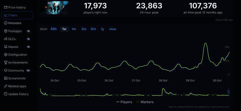 受万圣节活动和史低价促销的双重刺激,《战地2042》在Steam上的在线玩家提升了不少,当前24小时峰值23863人,当前在线17973人。