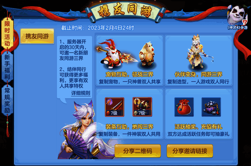 本周限【云中锦书】服务器开放。服务器开放后30天内,当前等级达到服务器等级的角色即能以邀请人的身份参与活动,可在奖励-限时活动-携友同游中查看活动界面。如果新玩家是实名认证下首个帐号的首个角色,可以长按系统打开同游绑定界面,输入邀请人的邀请码绑定同游关系,该关系持续30天。每名新服邀请人最多绑定一名同游角色,双方在活动期内可互相复制装备、宠物,也可将伙伴变身为对方造型,享受双人同游的乐趣。绑定关系期间,双方完成每日活跃任务后还可获得同游礼包,礼包可在同游关系结束后打开,有机会获得稀有道具奖励。