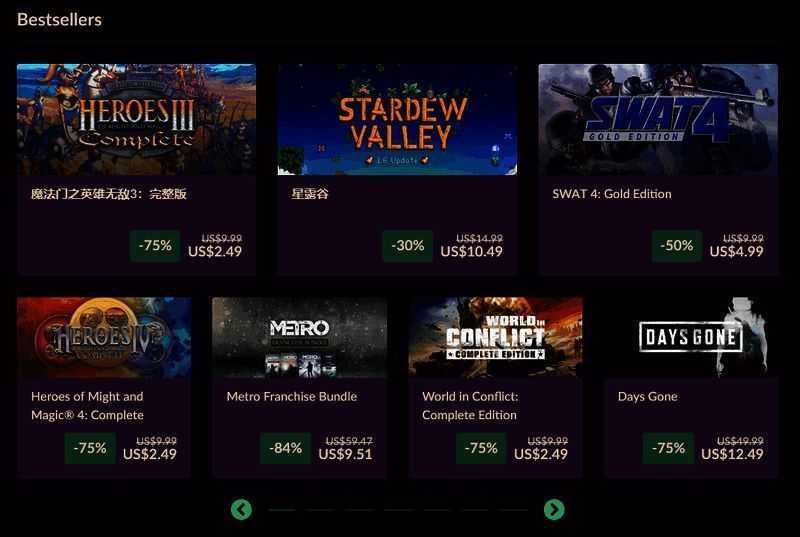 与 Steam 等平台不同的是,该平台上所有游戏均没有 D 加密,购买后游戏就真的完全属于你。当然相应的游戏选择可能没有那么多,但包含了大量经典作品,例如《魔法门之英雄无敌》系列、《潜行者》系列、《杀出重围》系列等。其中《地铁》全系列仅需9.51 美元,而《英雄无敌》全系列补卡仅需17.44 美元。