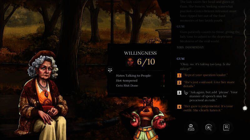 做你自己最坏的一面。来吧,踢那个老妇人一脚。别害怕。我们会倒带时间,她甚至不会记得。来吧。你知道你想要。没关系。去做吧。