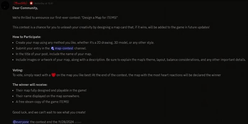 Fntastic在游戏的官方Discord频道上发文称:“本次比赛是一个让大家释放创造力的机会,大家可以设计一张地图,如果获胜,这张地图将在未来的更新中被添加到游戏中!”