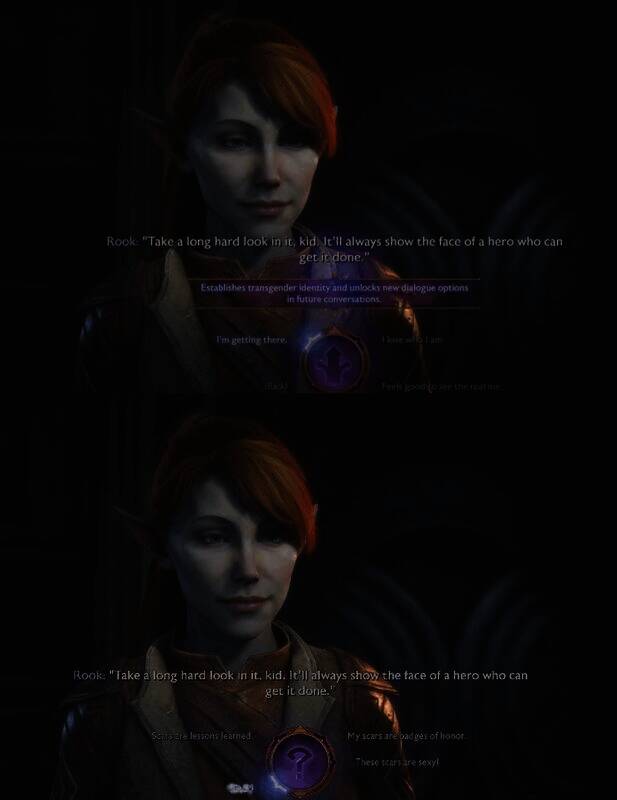 近日游戏博主Mangalawyer发现《龙腾世纪4》的对话在宣扬ZZZQ价值观:在某个对话中,系统提示玩家可通过创建跨性别角色解锁更多对话选项,有网友表示这是变性人总监在夹带私货。