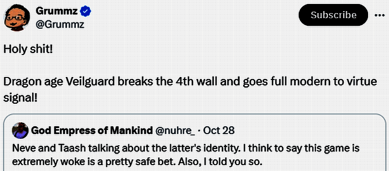 还有获得测试资格的玩家发现,《龙腾世纪4》NPC竟然也在大谈"性别认同" 。前暴雪制作人Grummz表示:“《龙腾世纪4》打破了第四面墙,完全以‘现代化’方式彰显了美德!”