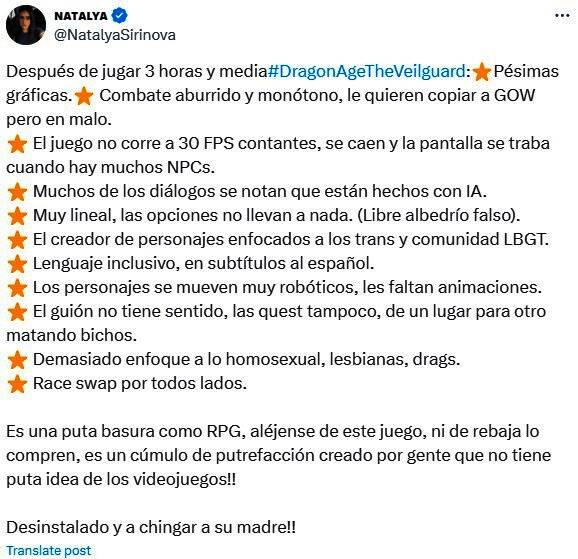 此前参与了《龙腾世纪4》测试的美女博主Natalya Sirinova表示:“《龙腾世纪4》画面糟糕,战斗无聊单调。游戏充满Bug,出现大量NPC时游戏会崩溃。剧情线性,玩家选择毫无意义。游戏过于ZZZQ,对同性恋的关注过多。这就是一款垃圾游戏,奉劝大家别买,打折也别买!”