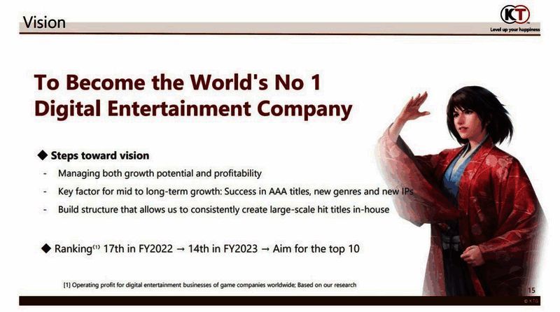 在财报幻灯片里,公司显示出了非常大的野心,称目标是“成为全世界第一的数字娱乐公司”,财报的其他地方它确认其目标至少是“成为全球最赚钱的10 大游戏公司之一”。为达成这一目标,公司计划将努力每年推出一款主要游戏,而不是间隔多年才推出一款作品。