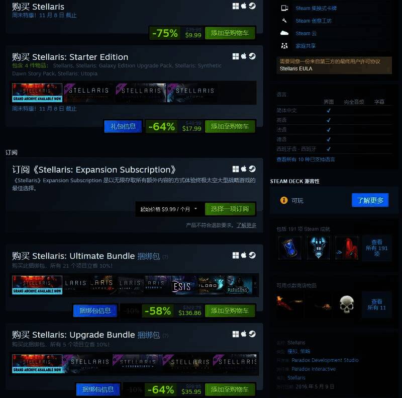《群星:宏伟档案》支持简体中文界面,Steam国区售价78元暂无折扣,游戏本体和捆绑包目前正在特惠中。
