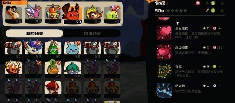 在属性上化蝶需要抓固执性格的精灵,这个性格可以增加魔攻魔防,技能上携带生日蛋糕、超级糖果、食腐以及晒太阳等技能。