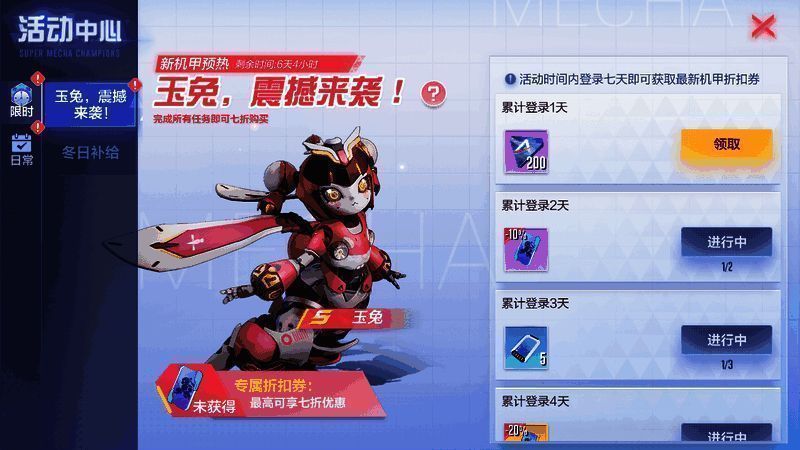 新机甲即将上线!1月10日至1月17日,累计登录最高可获得玉兔七折购买折扣券!
