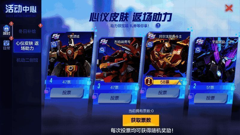 完成每日任务即可获得助力票,选手可以给心仪的奖池助力投票,返场奖池由你决定!