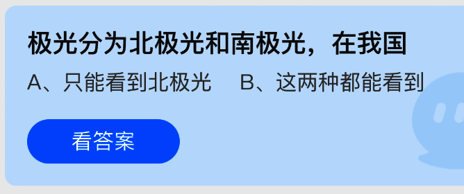 极光分为北极光和南极光,在我国?这是支付宝蚂蚁庄园小鸡答题4月22日题目,支付宝小鸡答题是大家非常喜欢的活动,大家获取饲料就可以喂养小鸡领取更多的蛋去帮助更多的人了!今日正确答案是【只能看到北极光】,在南极发生的叫南极光,在北极发生的叫北极光。我国在北半球,所以在我国只能看到北极光。