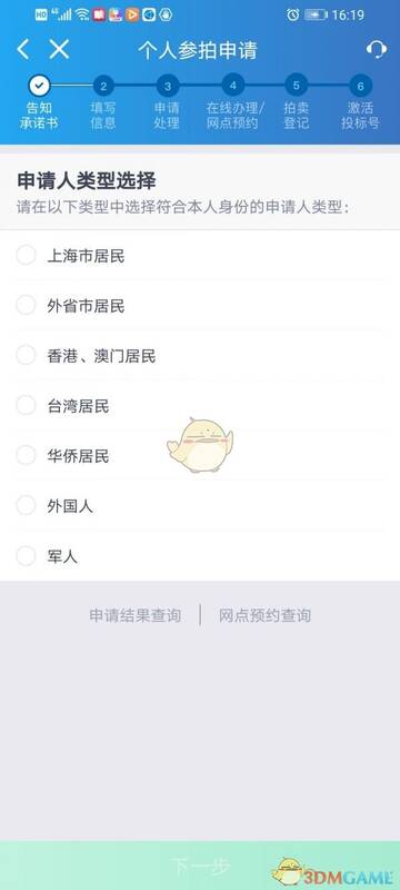 5、然后点击进入,选择申请人类型,点击下一步(如下图所示);