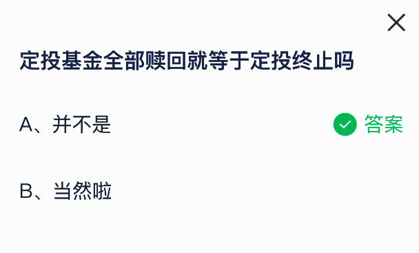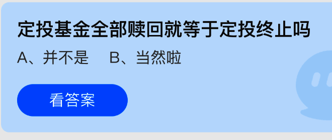 定投基金全部赎回就等于定投终止吗?这是支付宝蚂蚁庄园小鸡答题4月22日题目,选择正确答案,答对可获得 180g 饲料,答错则获得 30g 饲料。为了保证正确率,本次给大家带来了今日正确答案:【并不是】。基金赎回是指投资者将其持有的基金份额卖出的行为。这并不意味着取消了基金投资,而是投资者选择将部分或全部基金份额变现。