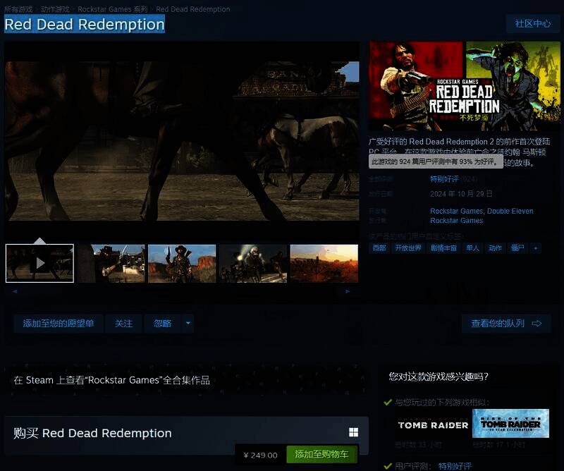 《荒野大镖客:救赎》已在Steam上发售,国区售价249元。目前该作在Steam总评为“特别好评”,许多人表示该作是属于百玩不厌的游戏,优化的很好不是暴力移植。