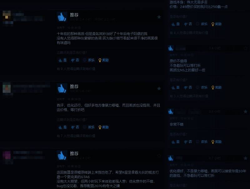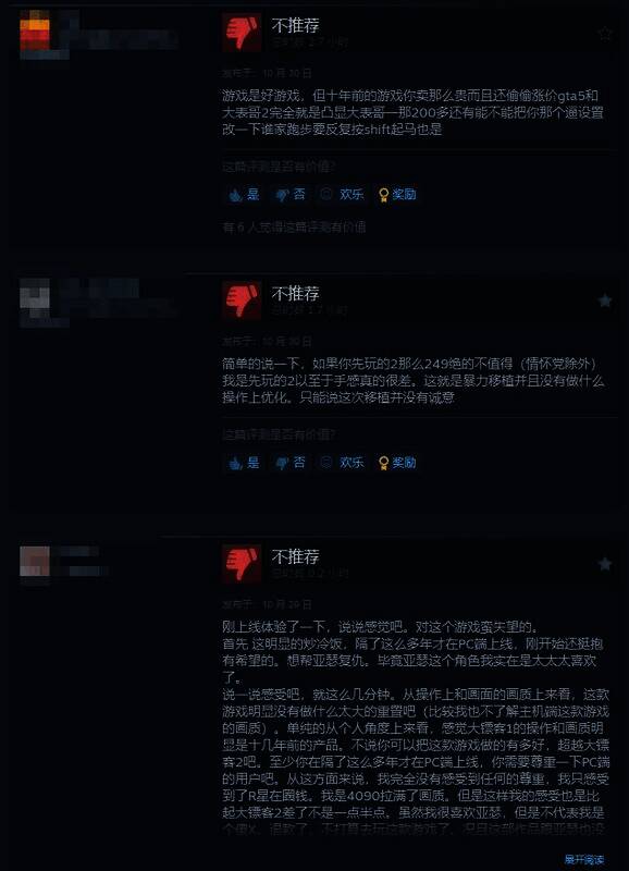 给出差评的玩家认为,《荒野大镖客:救赎》是好游戏,但十年前的游戏还卖那么贵。移植没有诚意,就是在炒冷饭。不是真爱粉不要买!