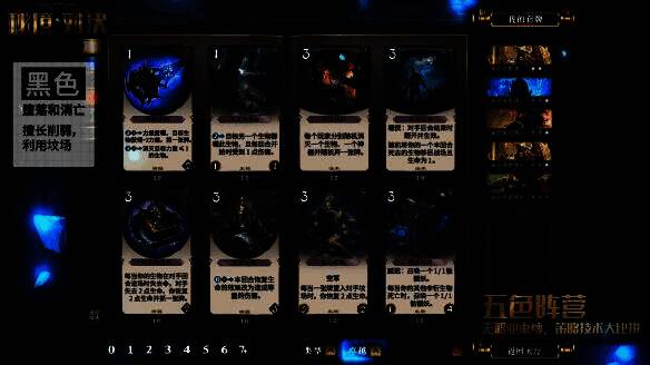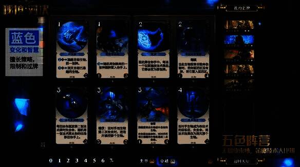 蓝色卡牌是变化和智慧的颜色。蓝色卡牌重视策略,拥有丰富的限制型能力。它们由拥有巨龙之力的冬拥骑士团、青金塔等势力构成。