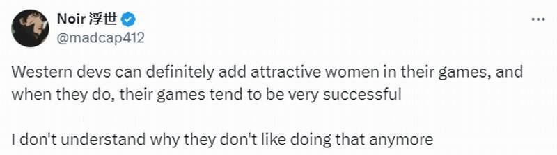 近日有推特网友发文称:“西方开发商绝对可以在他们的游戏中加入有吸引力的女性角色,而且当他们这样做的时候,他们的游戏往往会大卖。我不明白,为何他们不再喜欢这么做了”,这也在网上引起了玩家热议。