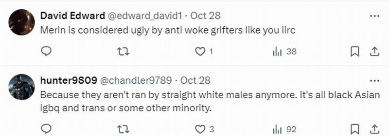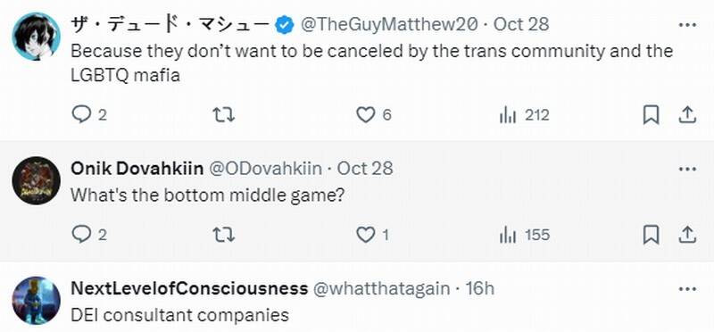 评论区有人表示:“因为他们不想让自己的游戏被跨性别社区和LGBTQ黑手党给取消掉。”“都怪DEI咨询公司”“他们在强迫所有男人慢慢变成基佬!”“因为他们不再由白人直男管理,而是黑人、跨性别者等。”
