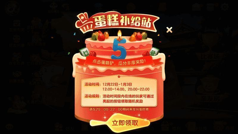 蛋糕补给站,初冬领好礼,自12月22日至1月3日,牌友们在12:00-14:00、20:00-22:00两个时段上线,即可瓜分丰厚奖励。助力赛场赢牌不断!