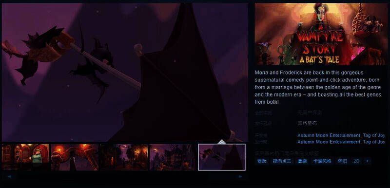 今日(10月29日),喜剧点击冒险游戏《AVampyre Story: A Bat's Tale》Steam页面开放,发售日待定,暂不支持中文,感兴趣的玩家可以点击此处进入商店页面。