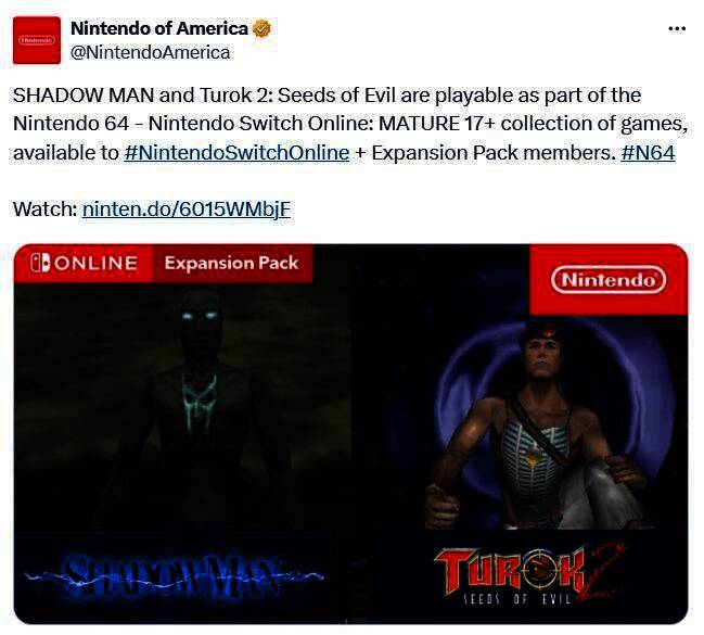 10月29日,美服Switch Online会员经典游戏库宣布将新增两款N64游戏:《夜影侠》和《恐龙猎人2:罪恶之种》,即日起正式上线,订阅了Switch Online会员+扩展包的玩家可以免费畅玩。