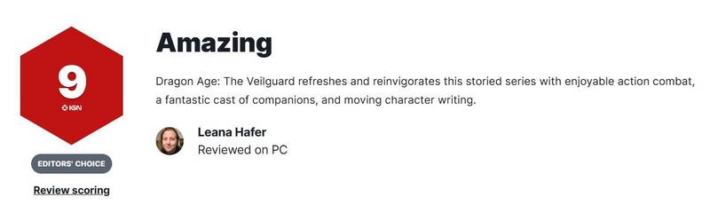Bioware的“龙腾世纪”系列最新作品《龙腾世纪:影障守护者》媒体评分现已解禁,诸多媒体都在第一时间给出了评价。其中备受玩家关注、讨论热度极高的媒体IGN给这款游戏打出了9分(Amazing)。