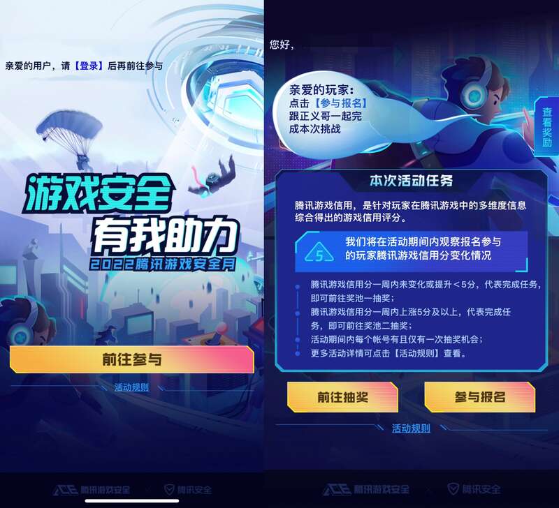 相比往届安全月,本次【游戏安全,有我助力】活动的参与方式“化繁为简”,玩家可通过登录报名网页,点击【参与报名】则视为报名成功,活动规则也非常直观,满足条件的玩家只需要保持腾讯游戏信用分一周之内未产生变化,即可获得抽奖资格,同时若玩家在周期内产生信用分上涨5分及以上,则可进入奖励更加丰富的奖池进行抽奖。不仅简化了活动的参与流程,维持信用分获取抽奖资格的规则也让各位玩家间接参与到了保护游戏安全的队列中。