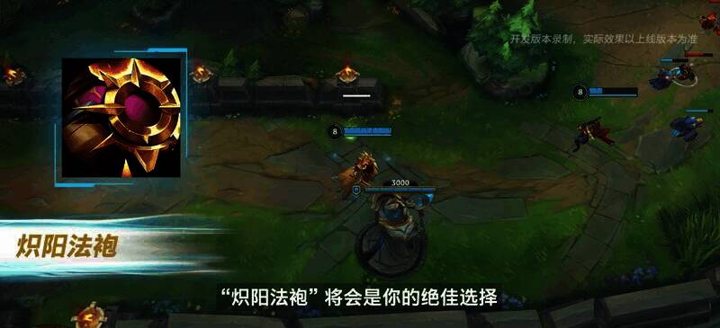 春节版本,将迎来一个全新的装备“炽阳法袍”,在定身一名对方英雄后,“炽阳法袍”会对敌人造成伤害,并显露附近的敌方英雄,自己被定身时也会触发这一效果,可以说是有控制型的近战英雄福音。