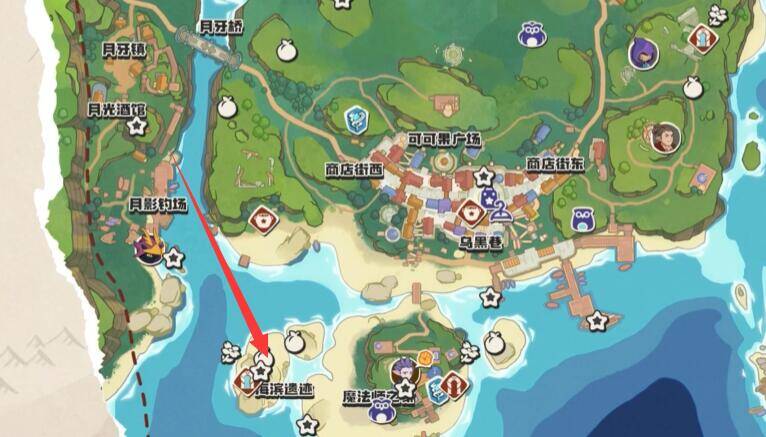 海滨遗迹主要由沙滩、礁石群和废弃神庙构成,玩家可在此捕捉水系、草系精灵或通过翻找点获取道具。地图中散布着14个宝箱,部分需特定属性精灵开启,例如魔法师之家附近的宝箱需水系技能激活遗迹内存在一次性秘境挑战,通关后可获得眠枭之星、国王球碎片等稀有资源。
