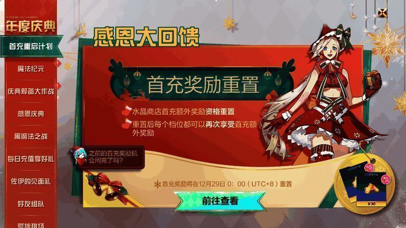 游戏将于2022.12.29日0点(UTC+8)进行水晶商店首充额外奖励资格重置,重置后每个档位都可以再次享受首充额外奖励。