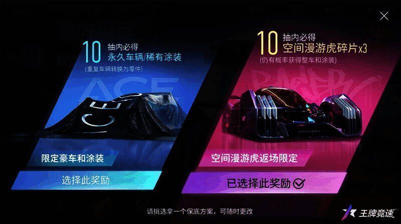 为了让更多车手抽取到心仪的奖励,豪华补给新增了车辆碎片永久有效福利和保底机制自主选择的全新功能,活动提供10抽内必得奖池内永久赛车/涂装和10抽内必得空间漫游虎碎片包两种机制,前者车辆可重复获得,重复获得后会自动转换为零件,后者仍有概率抽中永久赛车/涂装,车手们可根据自身需求进行选择,并可以随时调整。