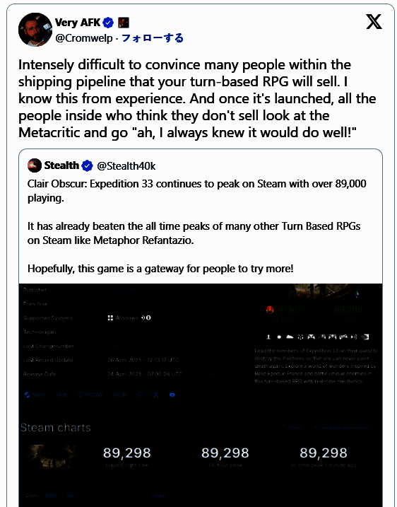 ·Michael Douse当然不是心血来潮,而是引用了刚刚发售同样爆火的即时机制回合制角色扮演游戏《光与影:33号远征队》的表现有感而发,不过有了如此傲人的成绩,今后可以相信好的回合制游戏肯定会发光,必定会被玩家认可的。