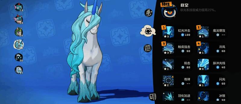 在技能搭配选择上,为了能够突出自身的特点,当然是以魔法攻为主。小编的搭配是虹光冲击、魔法增效、触底强击和冷风这四个,搭配的思路是强化输出能力。冷风,造成魔法伤害,威力60。虹光冲击,威力100,对敌方精灵造成高额魔法伤害。触底强击,威力60,造成魔法伤害,如果释放后能量耗尽,本次攻击威力加100。魔法增效,直接提升80%魔攻。这样搭配起来,再配合上自身属性上的优势,甚至可以对敌方进行一击秒杀。