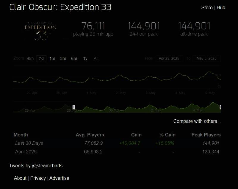另外,SteamChart统计显示《光与影:33号远征队》Steam平均游玩人数有了进一步的增长。4月平均游玩人数66998人,而5月份增长到77082人,涨幅超过15%。