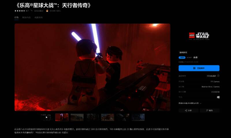 《乐高星球大战:天行者传奇》Epic国区原价248元,支持繁体中文,2022年4月8日发售。