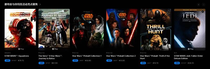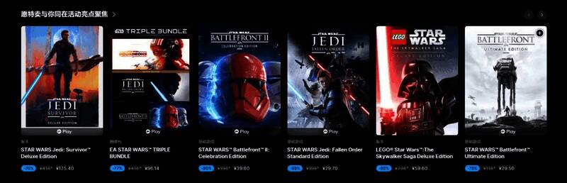 除了免费送游戏外,Epic商城还在星战日开启了多个《星球大战》游戏促销活动: