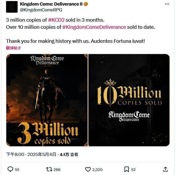 《天国:拯救2》官推宣布,这款第一人称中世纪开放世界RPG,发售三个月销量达到300万套。至此,《天国:拯救》系列累计销量正式突破1000万套。
