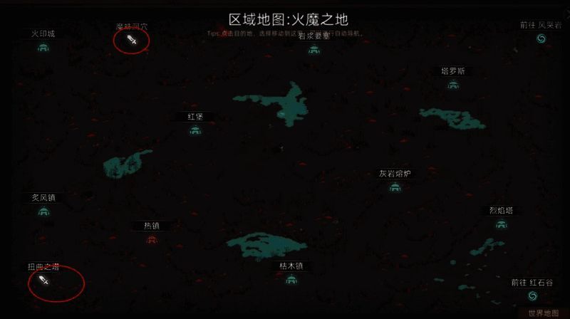 扭曲塔位于火魔地图左下角,只能通过地图上的三个传送门进入,地图右下角、右上角、左上角都有一个魔界传送门。