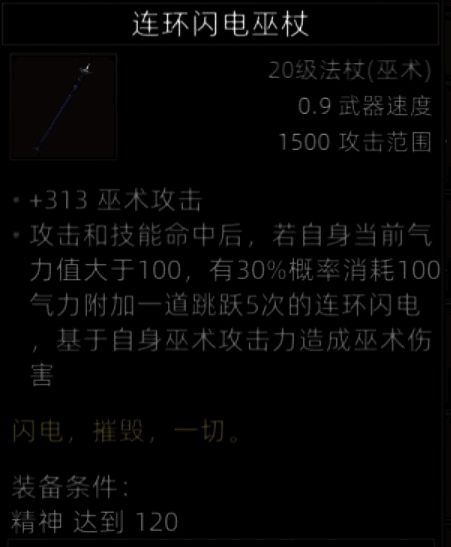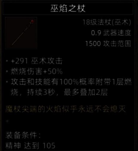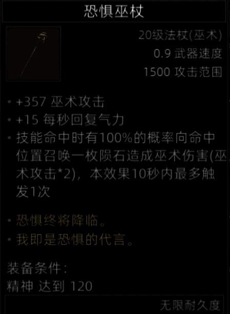 扭曲塔出的恐惧巫杖是目前输出最厉害的法杖,357之高的巫术值加成,而且还有10秒一次的2倍巫术值伤害的陨石,这就相当于直接上了一个高倍率的技能。