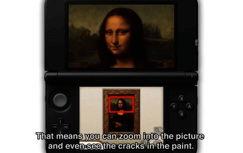 任天堂已故社长岩田聪与著名制作人宫本茂曾于十二年前亲自演示3DS的导览与定位功能。这款导览软件本身收录了卢浮宫大量标志性艺术品的高清图像与3D模型,包含600余幅高清展品图片、30小时的语音解说内容、400多组展厅3D场景重建。