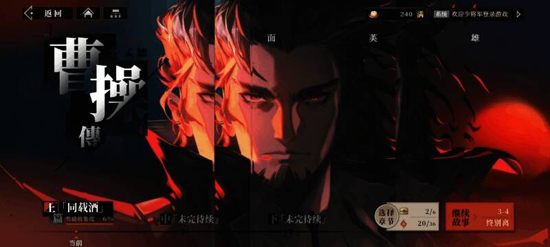 目前在主线的剧情当中,已经放出了关于曹操传的剧情内容,而在主线任务体系里,玩家的进度直接决定了玩家能够接取的任务具体内容,就曹操传而言,清晰地分为上、中、下三个篇章,而且每个篇章之下又进一步细分出多个章节,这样的设置,使得整个剧情层次分明,玩家需要成功通关前一章节,才能够顺利解锁后续的精彩剧情。