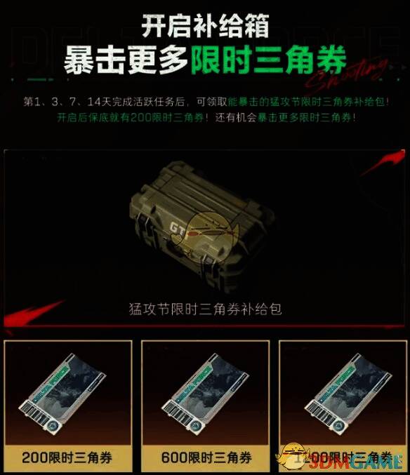 2、玩家在这段时间内每天登录游戏完成三个任务就可以获取100限时三角券或是限时三角券补给包。