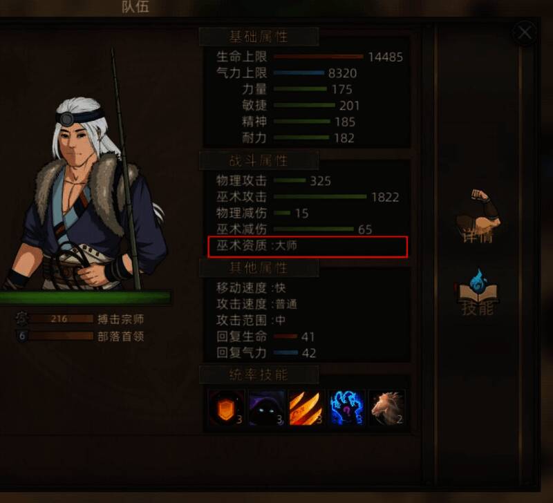 可以在队伍,详细里查看巫术资质。