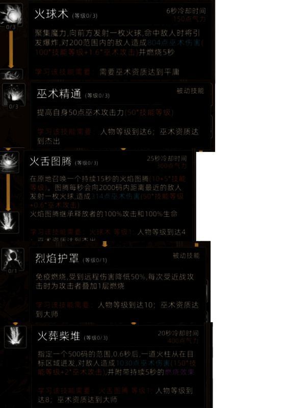 技能:火之巫术有3个主动、2个被动。